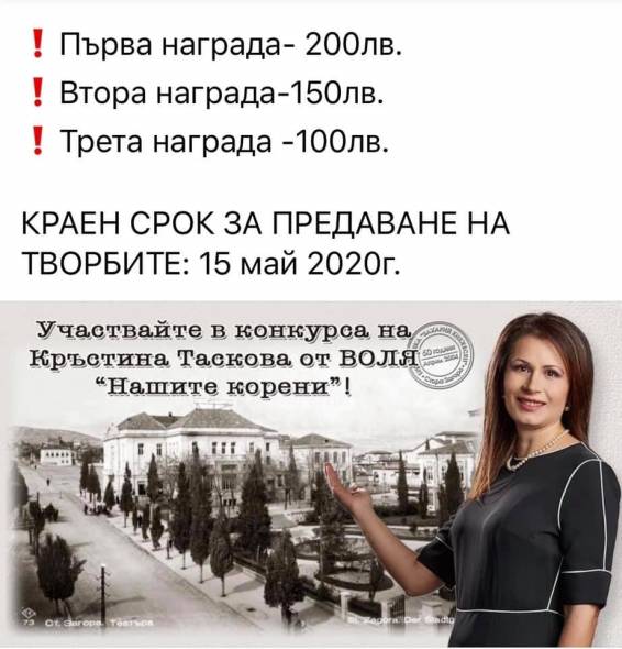 Зам.-председателят на ВОЛЯ Кръстина Таскова събра есета за огромните персони на Стара Загора посредством състезанието “Нашите корени ” и награди спечелилите с хубави парични награди и специфични грамоти. „ Благодаря на всички, които се включиха в състезанието! Радвам се, че дружно си припомнихме за хората - герои на града ни, за тези, които са държали или държат духа на Стара Загора жив “, съобщи Таскова.