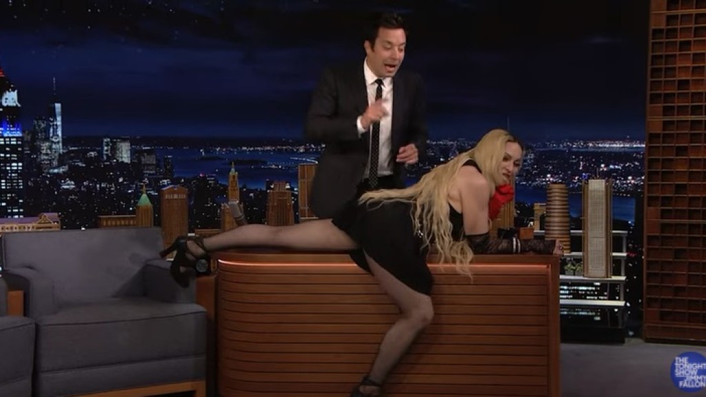 Когато Джими Фалън е на екран, човек не може да е сигурен дали обстановките в студиото му не са просто инсценирани за да предизвикат публиката, само че несъмнено съумя да го шашне да във " Вечерното шо " ”, когато се качи и легна в предизвикатлена поза на бюрото му.