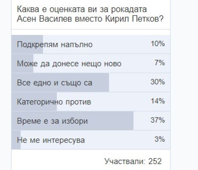 37 % от участниците в запитването са дали отговор, че е време за нови избори и не виждат вяра в този парламент. 30 % не виждат разлика сред Макс и Мориц и за тях тя са като скачени съдове, които, обаче, в случай че се скарат ( не дай, Боже), не се знае с кого ще ни скарат още, защото към този момент ни скараха с Русия, като изгониха дипломатите им от страната, стопираха газа и още куп пакости.