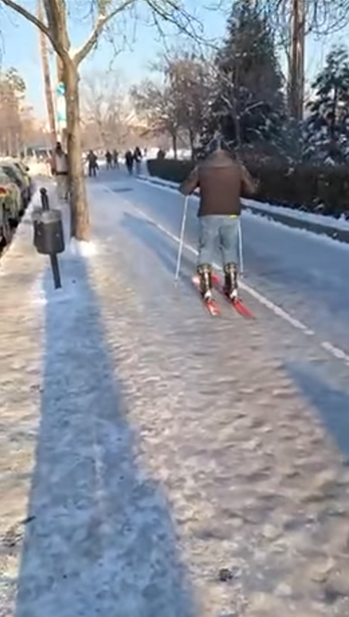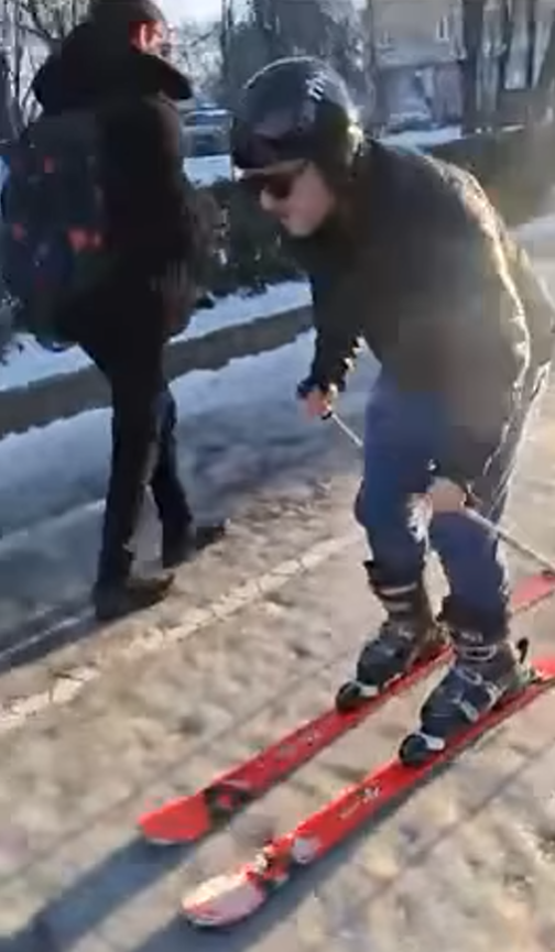 Пред НДК запалянко реши да покара ски, което не му се получи по никакъв начин зле, изключително върху заледените тротоари.