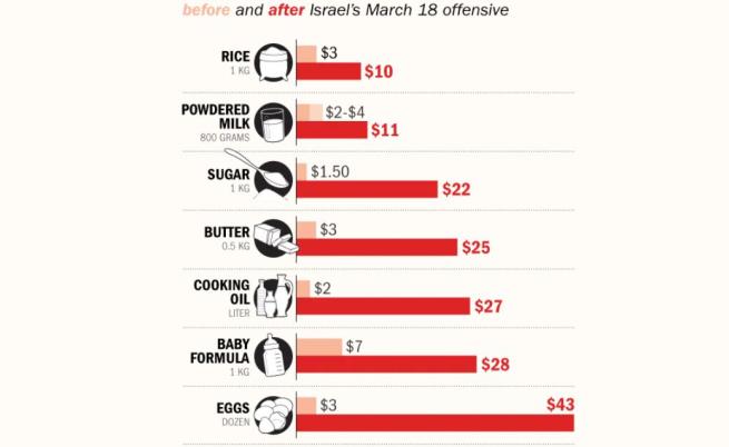 Пазарите, които в миналото са гъмжали от артикули и живот, в този момент са опустели след месеци на блокада, бомбардировки и стопански срив. Откакто израелските сили възобновиха настъплението на 18 март, цената на брашното се е нараснала с 5000 %, споделят локални поданици, а тази на олиото за готвене – с 1200 %.