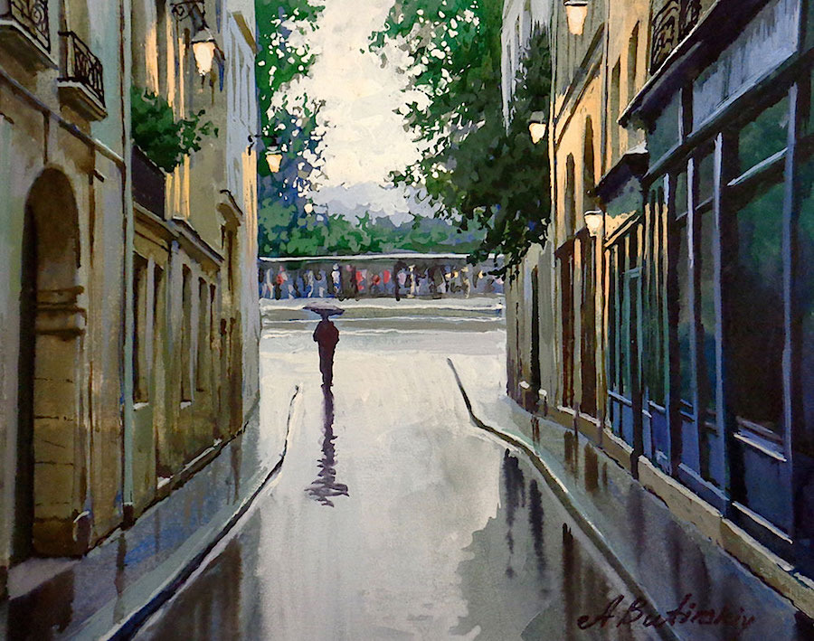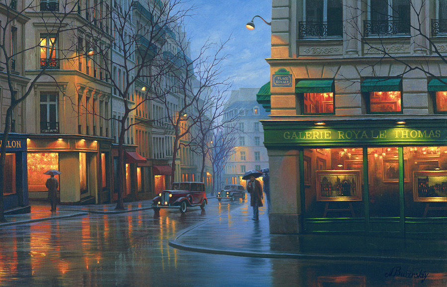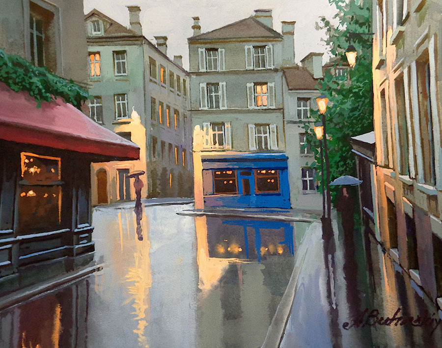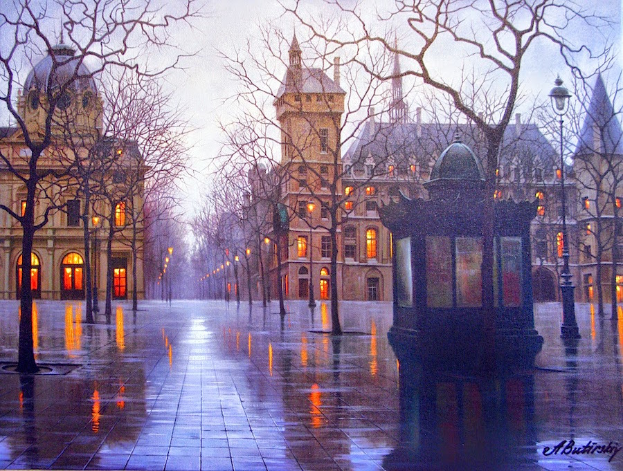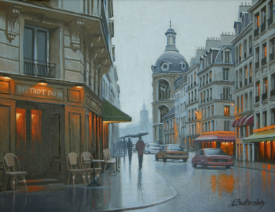 „ Когато рисувам, аз не просто копирам някое място. Опитвам се да запомня първото усещане, което то ми е направило и да обрисувам страстта, която съм почувствал ”, споделя съветския художник Алексей Бутирски. Неговите картини ни разхождат из всички кътчета на света, от най-прочутите градове, до най-притихналите селца. Те са живи, наситени с въодушевление, носталгични, чисти, дъждовни, празнични, същински. Вдъхновител е самия живот. Алексей е роден в Москва през 1974 година, а от 2001-ва до момента, има над 100 независими изложения по целия свят. Изтънчените му композиции майсторски се заиграват със светлите и тъмни тонове, а съчетанието на архитектура, цветове и форми е в действителност виртуозно.