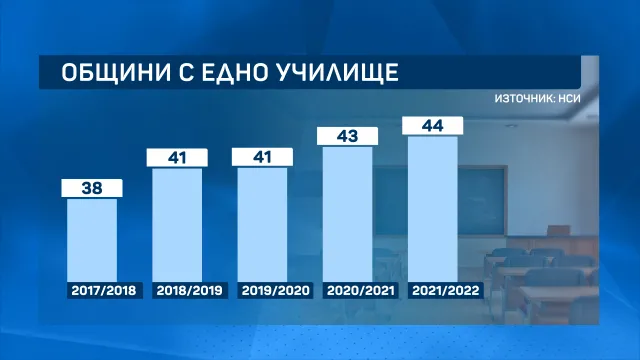 През последните години се усилва броят на общините, в които има единствено едно учебно заведение – от 38 преди 6 години до 44 в този момент. Или 17% от българските общини.