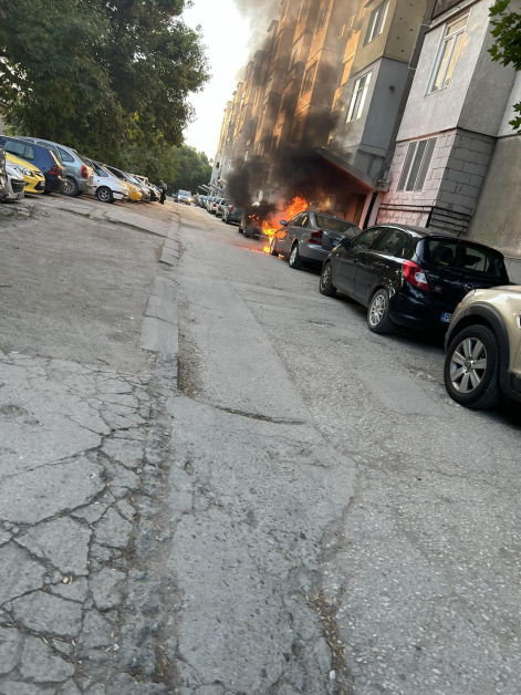 Кола избухна в пламъци пред блок в Пловдив СНИМКА