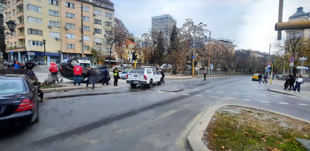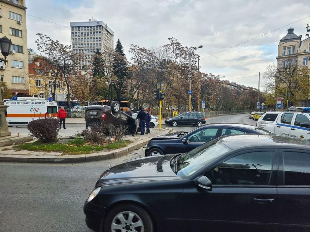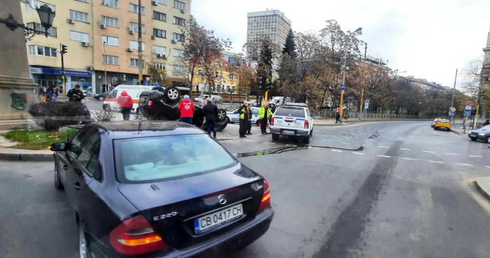Кола се обърна по таван на площад " Орлов мост " в центъра на София .