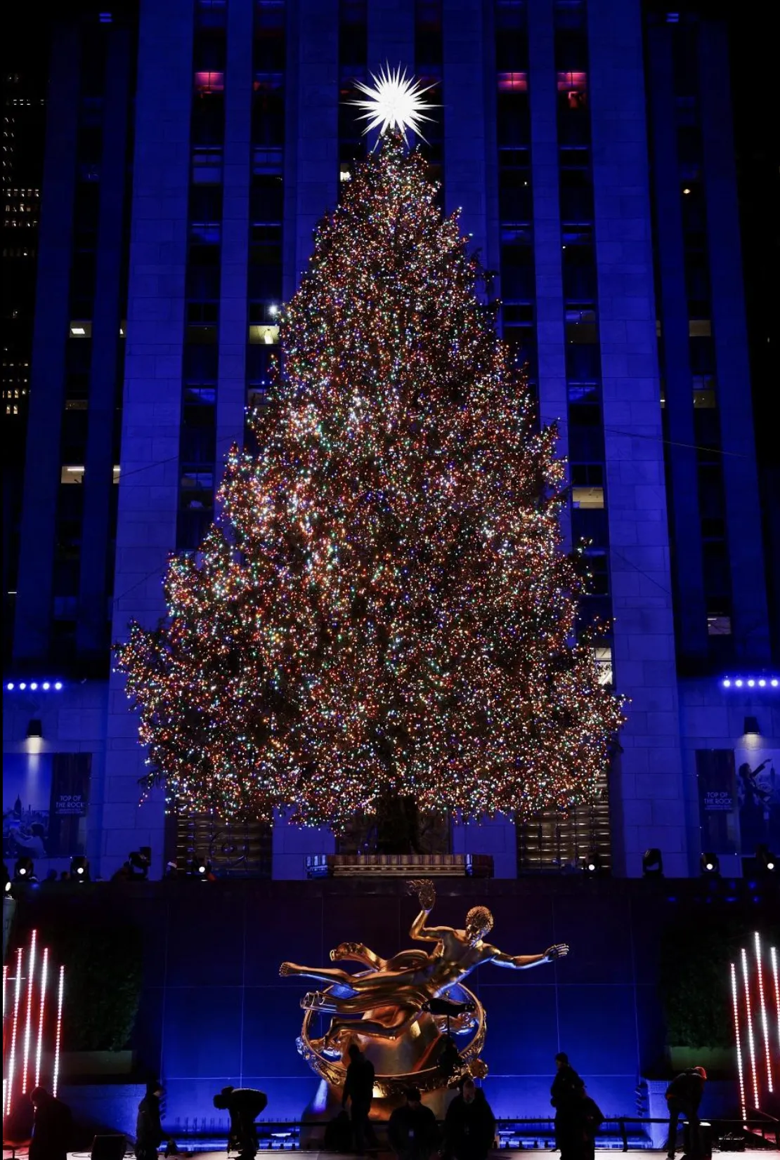 6. Коледната елха е осветена по време на церемонията по запалване на коледната елха в Рокфелер център през 2025 година в Манхатън, Ню Йорк
