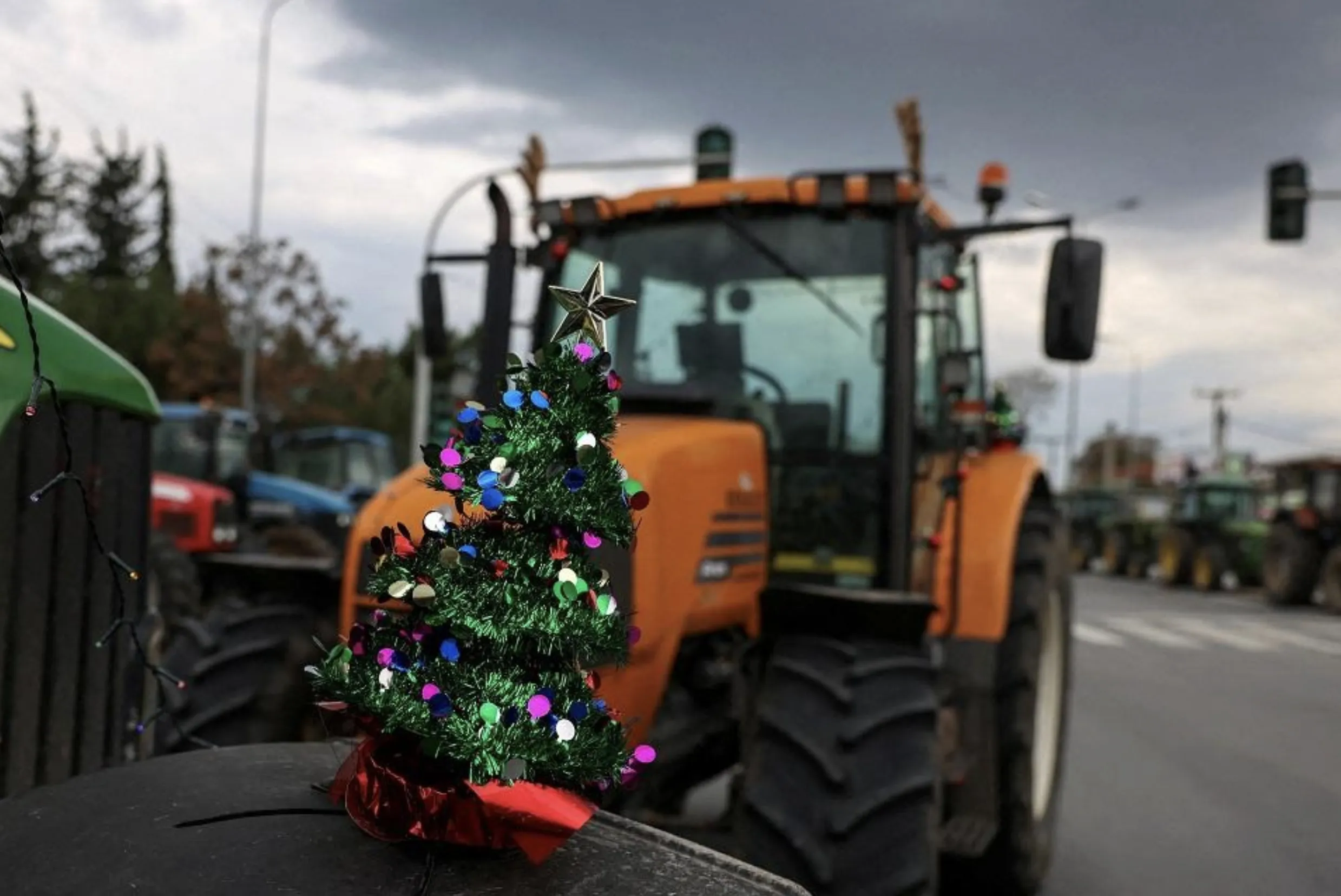 10. Коледна елха е сложена на трактор по време на митинг на фермери в Солун, Гърция