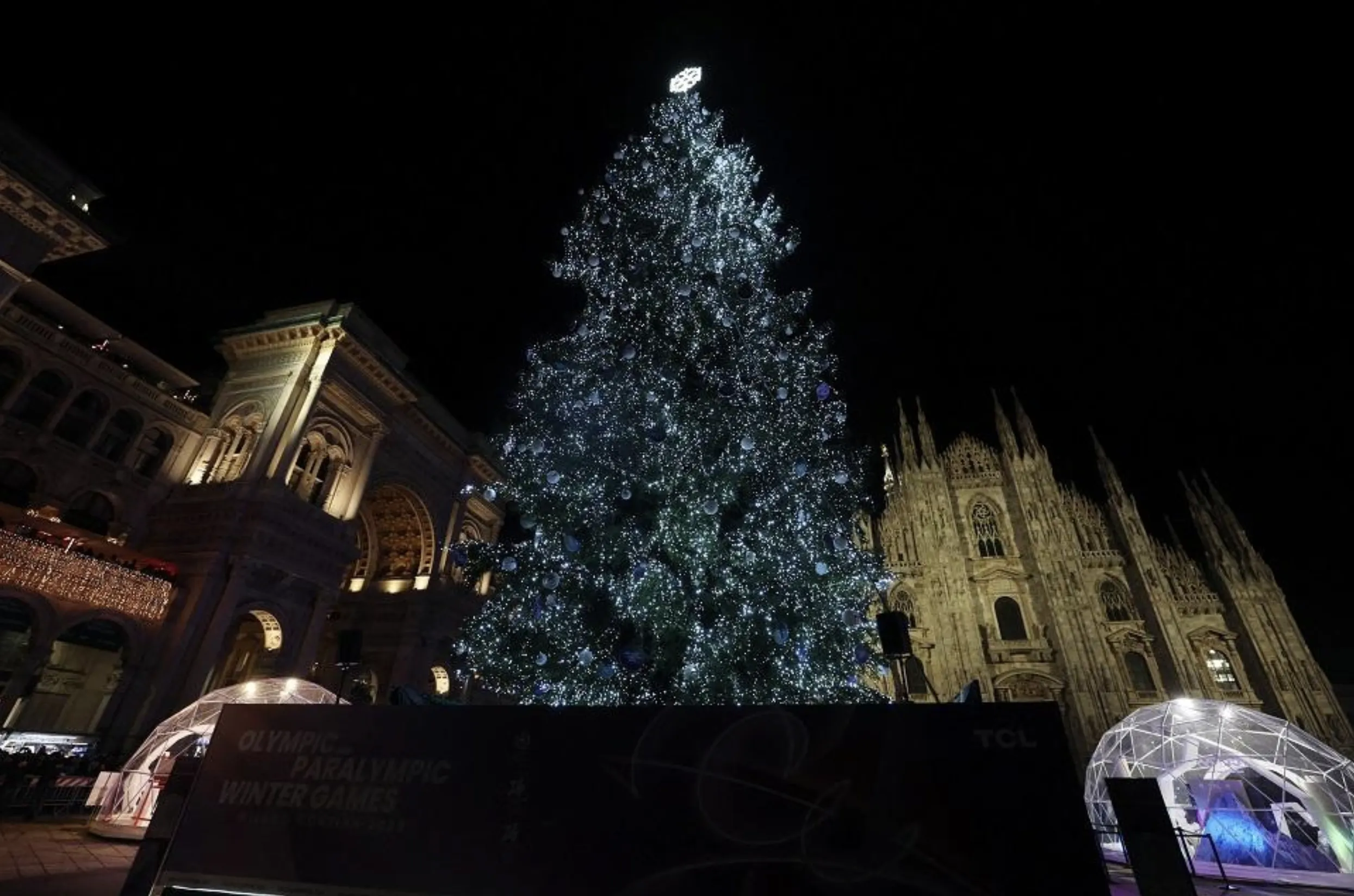 12. Коледната елха за Зимните олимпийски игри Милано-Кортина през 2026 година е осветена пред площад Дуомо в Милано, Италия