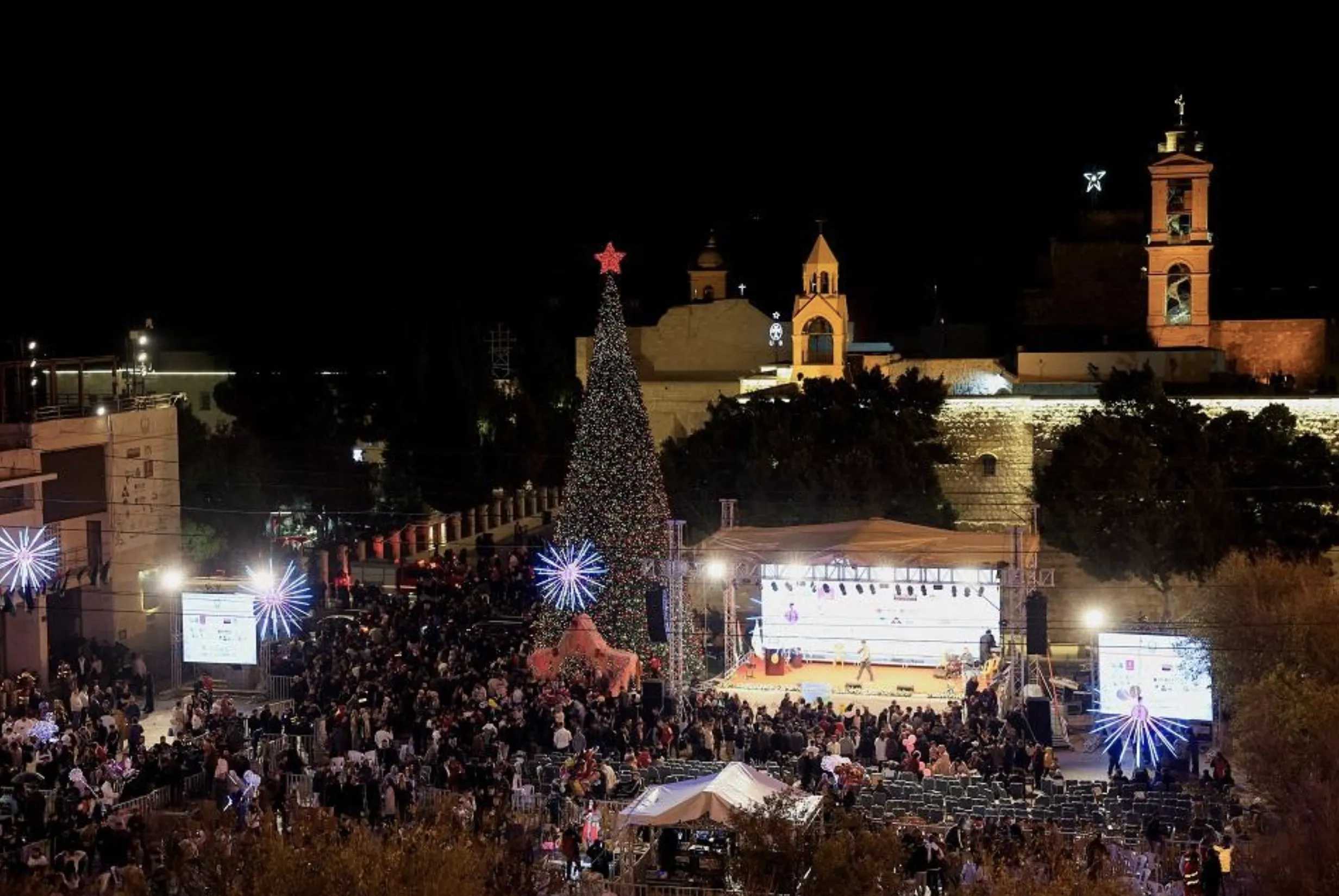13. Палестинци осветяват коледна елха на площад „ Мангер “ пред църквата „ Рождество Христово “ във Витлеем, в окупирания от Израел Западен бряг