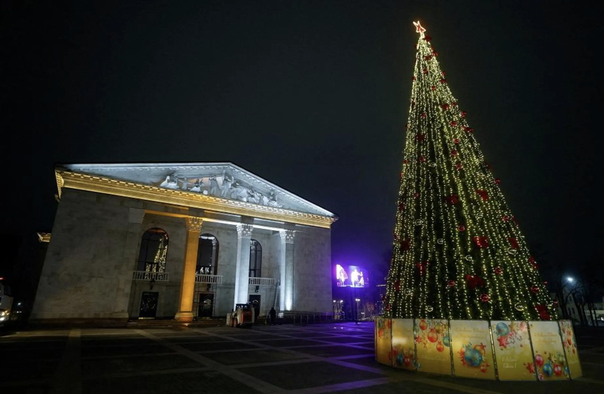 19. Коледна елха стои на площад покрай спектакъл, опустошен по време на съветския боен спор и по-късно възобновен, в Мариупол, следен от Русия град в Украйна