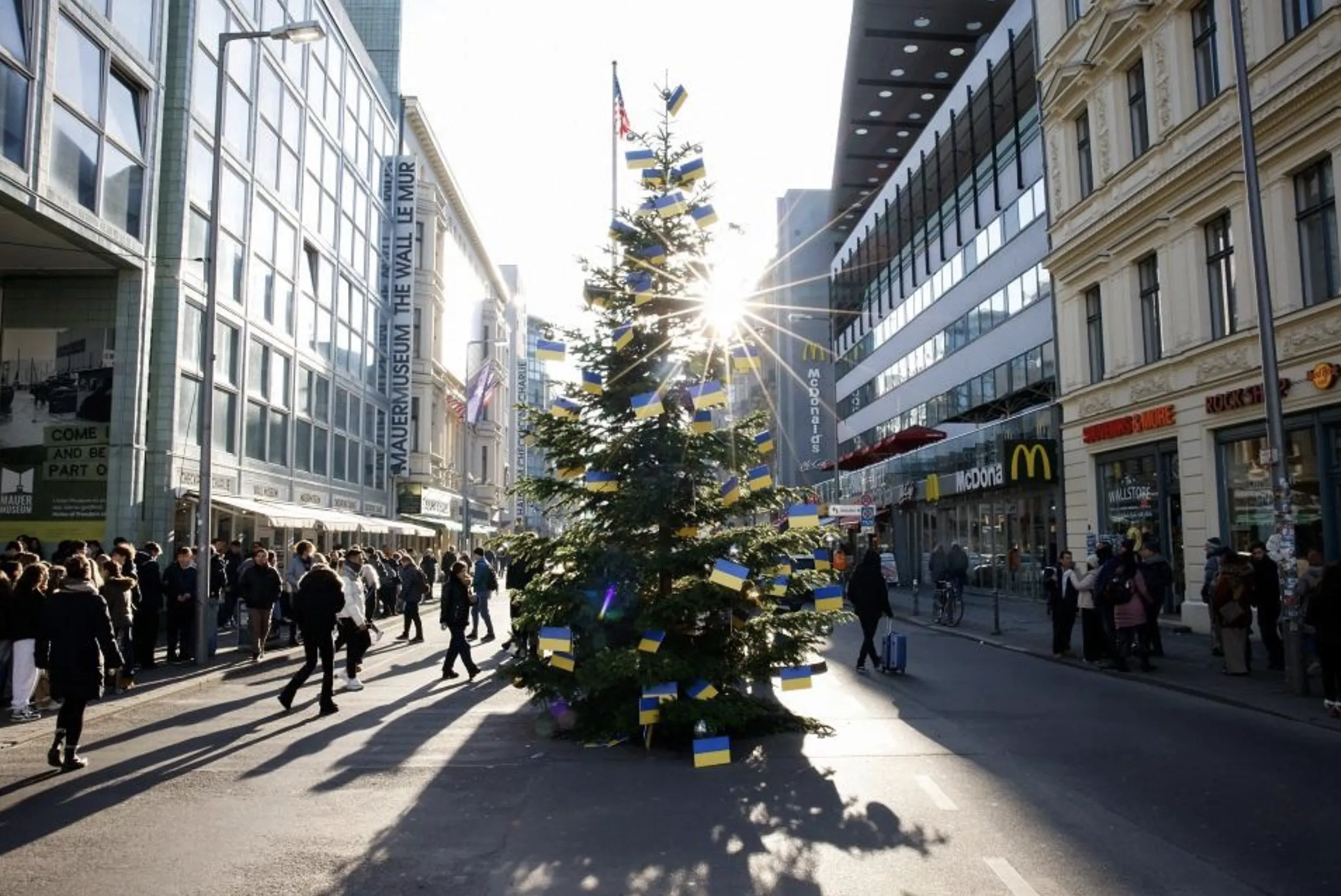 24. Коледна елха, украсена с украински флагове в Берлин, Германия