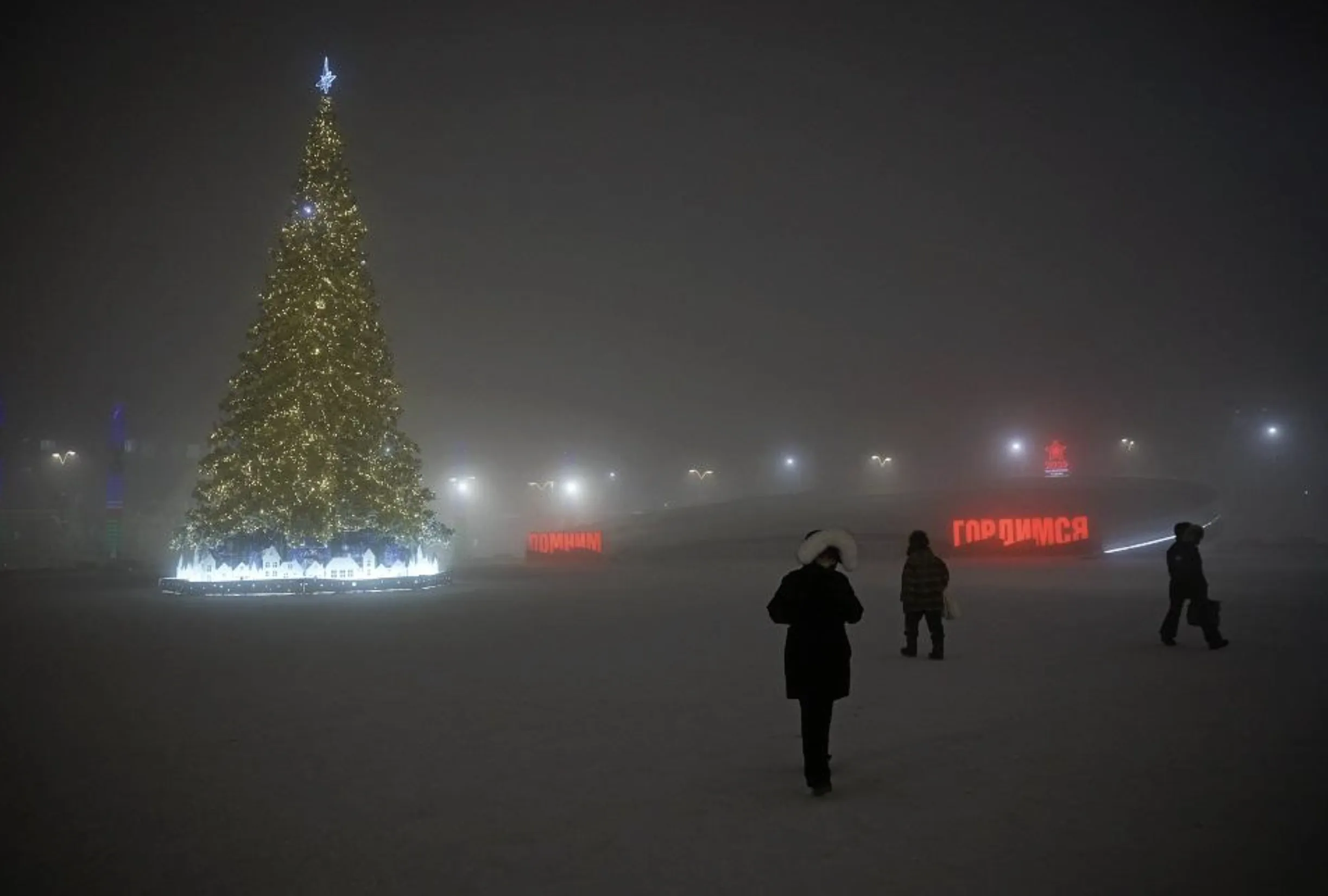 28. Хора се разхождат покрай коледна елха, откакто температурата падна под -47 градуса по Целзий в Якутск, столицата на Република Саха, Русия