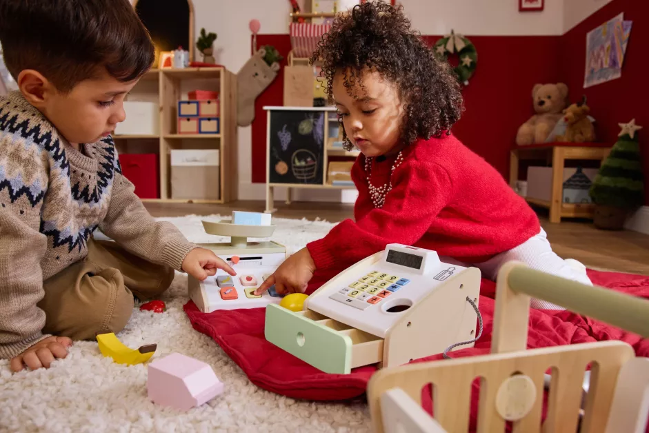 За децата, които обичат да влизат в ролята на продавачи и клиенти, Магазинът за игра (99,99 лева.) е съвършеният подарък. Комбинирайте го с Дървен комплект за магазин (касов уред или везна) за 19,99 лева, с цел да научите детето на първите му уроци по финансова просветеност, до момента в който се забавлява.