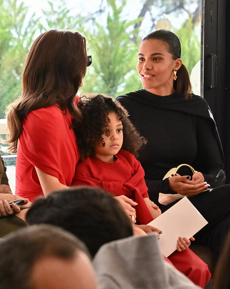 Доста по-атрактивна бе Кайли Дженър, която заложи на яркочервена къса рокля. Нещо повече, дружно с нея на първия ред седеше 5-годишната й щерка Сторми, облечена също в алено.