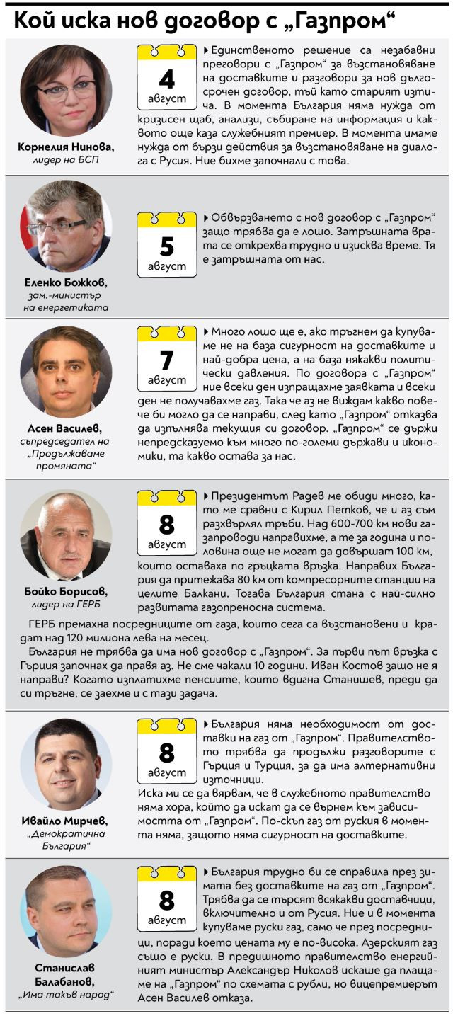 Колко би коствал газът, който идва в България, в случай че “Газпром ” не беше спрял доставките и заплащанията вървяха по контракта, който е в действие до октомври. Трябва ли нов контракт с съветската компания - тази тематика раздели политиците в България, като и двата лагера - “за ” и “против ”, имат причини. (Кой каква позиция заема виж графиката.)