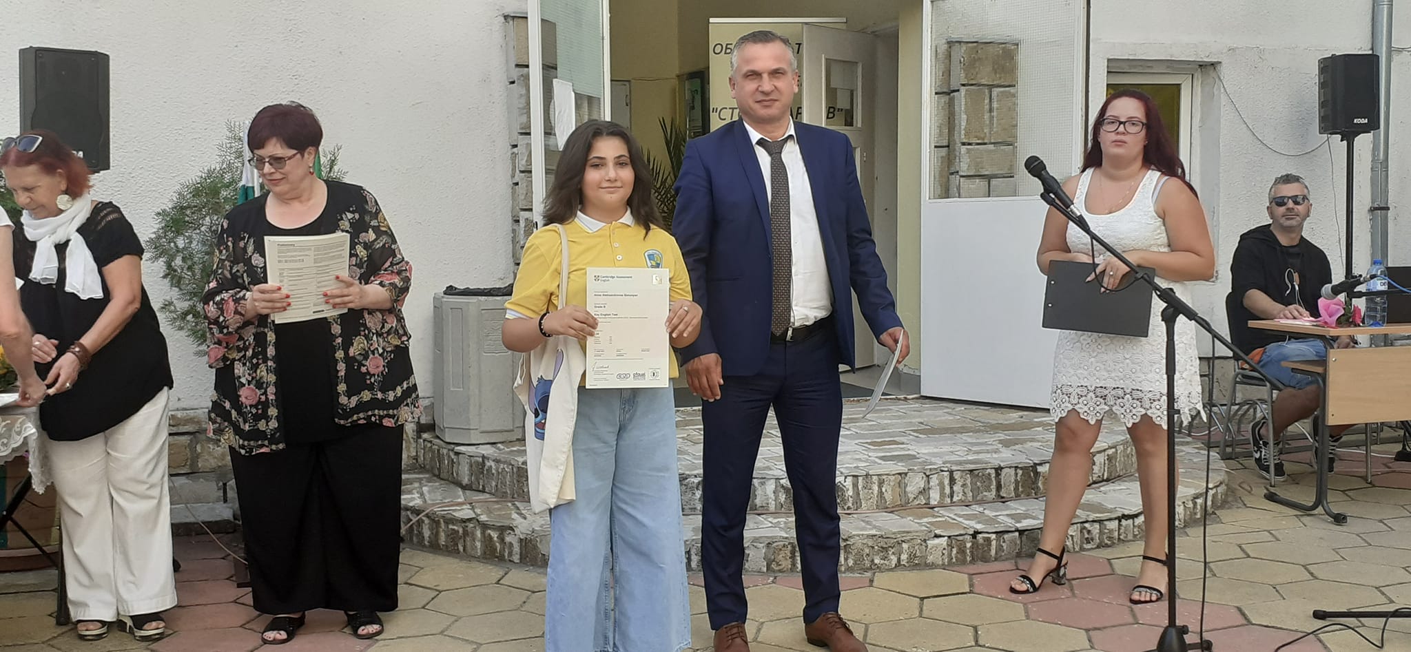 Директорката на учебното заведение дружно Светла Тошкова и кметът Стоянов връчиха документи на младежите за реализирани високи равнища на изпита по британски език за Кеймбридж.