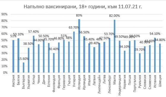 Според данните на Европейския център по предварителна защита и надзор на болесттите н апълно имунизирани против ковид у нас са 15,60% от популацията над 18-годишна възраст, а имунизирани с най-малко една доза - 17,4%. Това не просто отрежда последно място на страната ни. Повечето страни са с десетки проценти напред, а с доста сериозна преднина на предпоследния в таблицата Румъния, където ваксинирани са 29,70% от популацията на на възраст 18+.