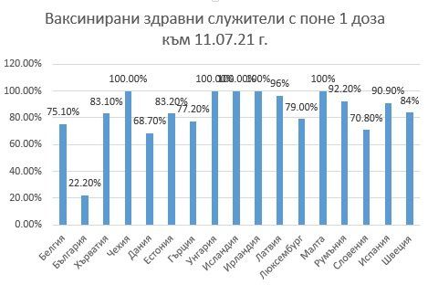 Още по-обезкуражаващи са данните за имунизационното покритие на здравните чиновници . Страната ни е на обичайното последно място със 20,20%, а в Дания, която е предпоследна по този индикатор, имунизираните медицински лица са 68,70%. Със 100% покритие са Чехия, Унгария, Исландия, Ирландия, Малта. Близо до тях е Испания. Дори в Румъния, с която постоянно се съпоставяме, ваксинираните здравни чиновници са 92,20%. Това може би е най-красноречивото доказателство за тоталната непопулярност на COVID-ваксините у нас.