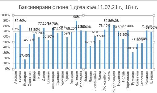 Обезсърчителни за България наподобяват и данните за получилите най-малко една доза ваксина в Европейски Съюз - 17,40% от хората над 18 години са с първа доза. Малката разлика от изцяло ваксинирани и получили първа игла демонстрира, че сега у нас се слагат главно втори дози и едвам 1,8% са се ваксинирали в последните седмици . За съпоставяне с един от " отличниците " по имунизационно покритие - Белгия - изцяло ваксинираните в тази страна са 53,10% от възрастното население, а с най-малко една доза са 80,60% от хората на 18+ години.