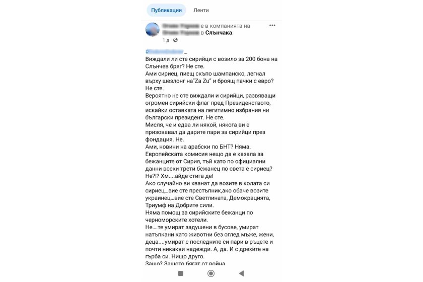 “Виждали ли сте сирийци с возило за 200 бона на Слънчев бряг? Не сте... Ами сириец, пиещ скъпо шампанско, лежащ върху шезлонг на Za Zu и броящ пачки с евро? Не сте. Вероятно не сте виждали и сирийци, развяващи голям сирийски байрак пред президентството, искайки оставка на законно определения ни български президент? Не сте. Мисля, че и надали някой, в миналото ви е призовавал да дарите пари за сирийци през фондация. Не. Ами вести на арабски по Българска национална телевизия? Няма... Ако инцидентно ви заловен да возите в колата си сириец, вие сте нарушител. Ако обаче возите украинец, вие сте светлината, демокрацията, успех на положителните сили. Няма помощ за сирийските бежанци по черноморските хотели... Не запитвам за избягалите от войната, лежащи на Слънчев бряг на наши разходи, с возила, които костват 150 български заплати и премятащи пачки с евра, нито за тези, които желаят оставката на държавния ни глава, определен с над 2 000 000 български гласа... Аз желая да попитам друго: Какво вършим с тези, които ги подстрекават и употребяват за антидържавни действия в цялостно нарушаване на българските закони? С тях какво вършим? С тези, които веят украински флагове от прозорците на държавни институции?... ”