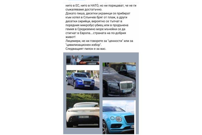 Facebook обява със фотоси на коли с украински регистрации внушава, че украинците в Слънчев бряг се придвижват с " возила за 200 бона ". Прави усещане, че създателят заобикаля непосредствено обвиняване, само че опълчва украинските бежанци и сирийските мигранти. Друго, което прави усещане, е неприятното качество на фотосите под обявата на създателя, който се е отбелязал от " Слънчака ".