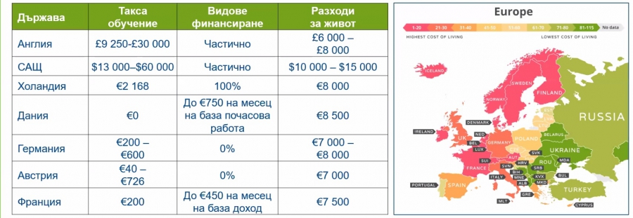 Пари и подготовка – това са акцентите за сполучливото кандидатстване за университет в чужбина, стана ясно от думите на Христанов. В презентацията си той особено показа какъв брой средства са нужни да бъдат покрити разноските за такса за образование и разноски за живот, когато учим в университет в чужбина. Г-н Христанов се спря на Англия, Съединени американски щати, Холандия, Дания, Германия, Австрия и Франция като образец, с едно огромно конкретизиране – в множеството от тези страни студентите могат да работят, с цел да заплащат таксата си за образование, само че с работа не могат да изкарат парите, нужни за покриване на целия размер на таксата. В някои страни, като Франция и Дания, има даже твърди граници на заплащането, което студент може да получи с почасова работа.