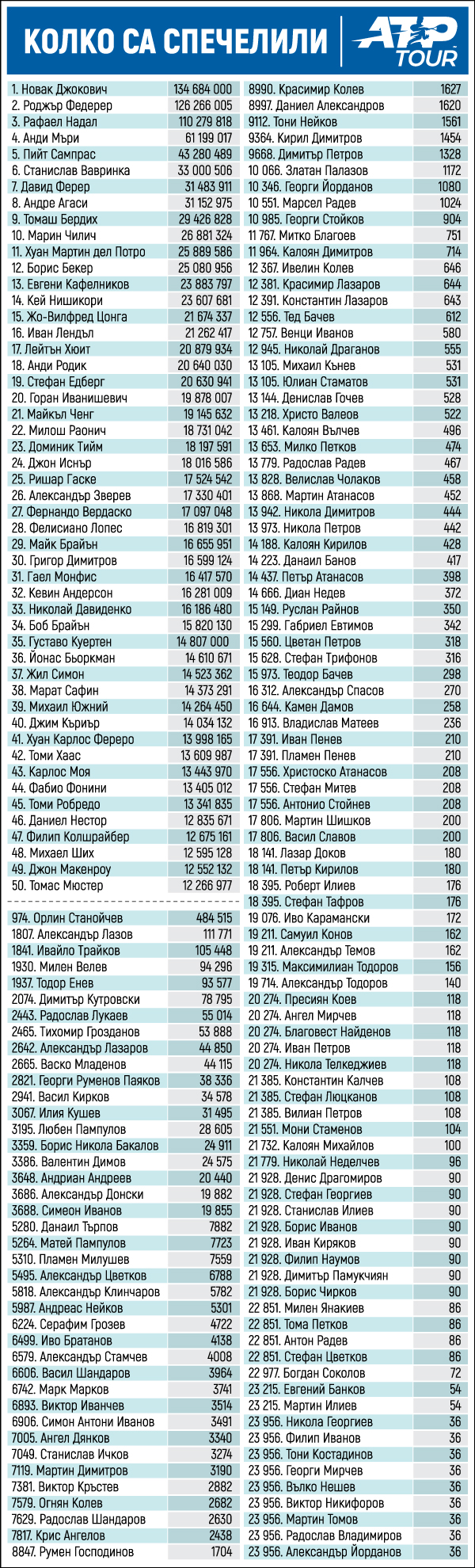 Единственият милионер от българските тенисисти е Григор Димитров. Той има над 16 милиона $ от наградни фондове и е на почетното 30-о място във безконечната класация макар огромните проблеми, които има през последната година. Все отново беше №3 в света и завоюва финалния шампионат на АТР в Лондон. Всички останали български състезатели не са спечелили общо колкото Григор Димитров. След него с близо половин милион от наградни фондове е Орлин Станойчев. Шестцифрени са парите на Александър Лазов и Ивайло Трайков.