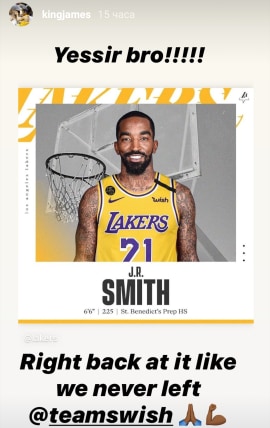 Джеймс закачи обявата с формалното показване на Смит като състезател на Лейкърс в " стори " -то си в " Инстаграм " и написа: " Завръщаме се, като че ли в никакъв случай не сме си тръгвали ". Както е известно, Джей Ар щe размени отказалия да взе участие в рестарта на сезона Ейвъри Брадли.
