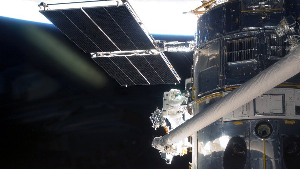 Астронавт на НАСА прави ремонтни действия, свързани с поддръжката на телескопа Хъбъл.