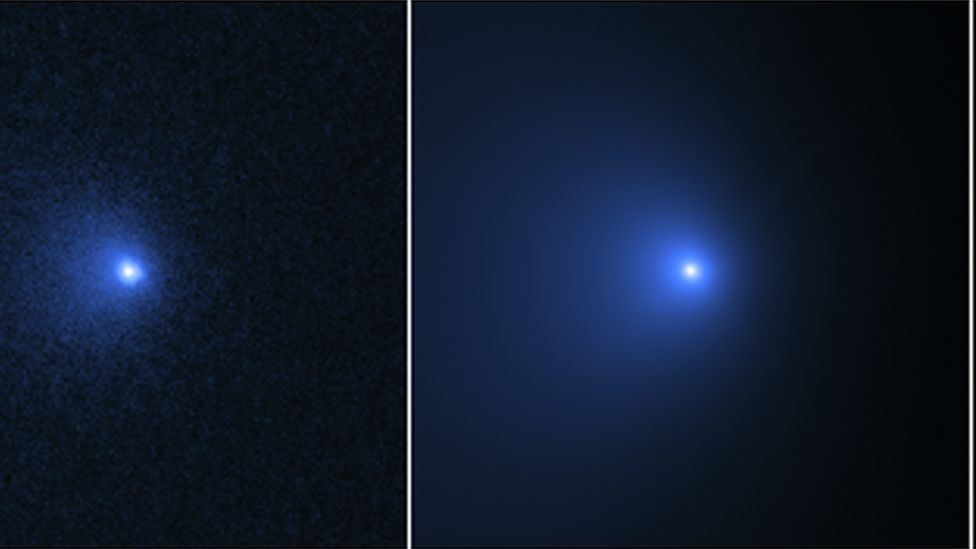 На фотографията отляво е снимана кометата на 8 януари 2022 година Снимката отдясно демонстрира „ комата “ (облак от галактически прахуляк, лед и газове, които обгръщат ядрото на кометата; комата и ядрото образуват главата на кометата). Професорът по планетарни науки в Калифорнийския университет на Лос Анджелист (UCLA) – Дейвид Джуит, добавя, чe учените постоянно са имали съмнения за големите размери на кометата, тъй като макар далечното ѝ разстояние тя била извънредно ярка, само че в този момент към този момент екипът от учени са безапелационни и удостоверяват големите ѝ размери.