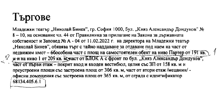 Регулаторът изпрати публична позиция, в която показва, че на 11 февруари 2022 година Младежкият спектакъл е разгласил на уеб страницата си обществена публикация, че провежда търг за отдаване чартърен на два етажа офисни пространства със застроена повърхност 365 кв. м. Това е станало със заповед на тогавашния шеф на театъра Владимир Люцканов. Началната цена на търга е била 10 700 лева без Данък добавена стойност на месец.В изискванията на търга е маркирано, че пространствата се отдават за комерсиална или стопанска активност. Също по този начин е написано, че предназначението на обекта не може да бъде променяно, а тъкмо това са желали от КЕВР.