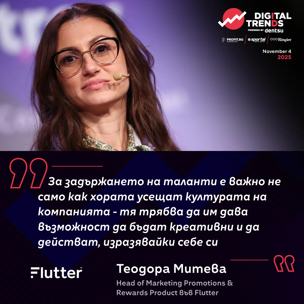 „ За задържането на гения е значима културата и това по какъв начин хората се усещат на даденото място, опцията да бъдеш изобретателен и да изразяваш себе си. Това несъмнено са нещата, които задържат един човек някъде “, безапелационна беше Теодора Митева от Flutter.