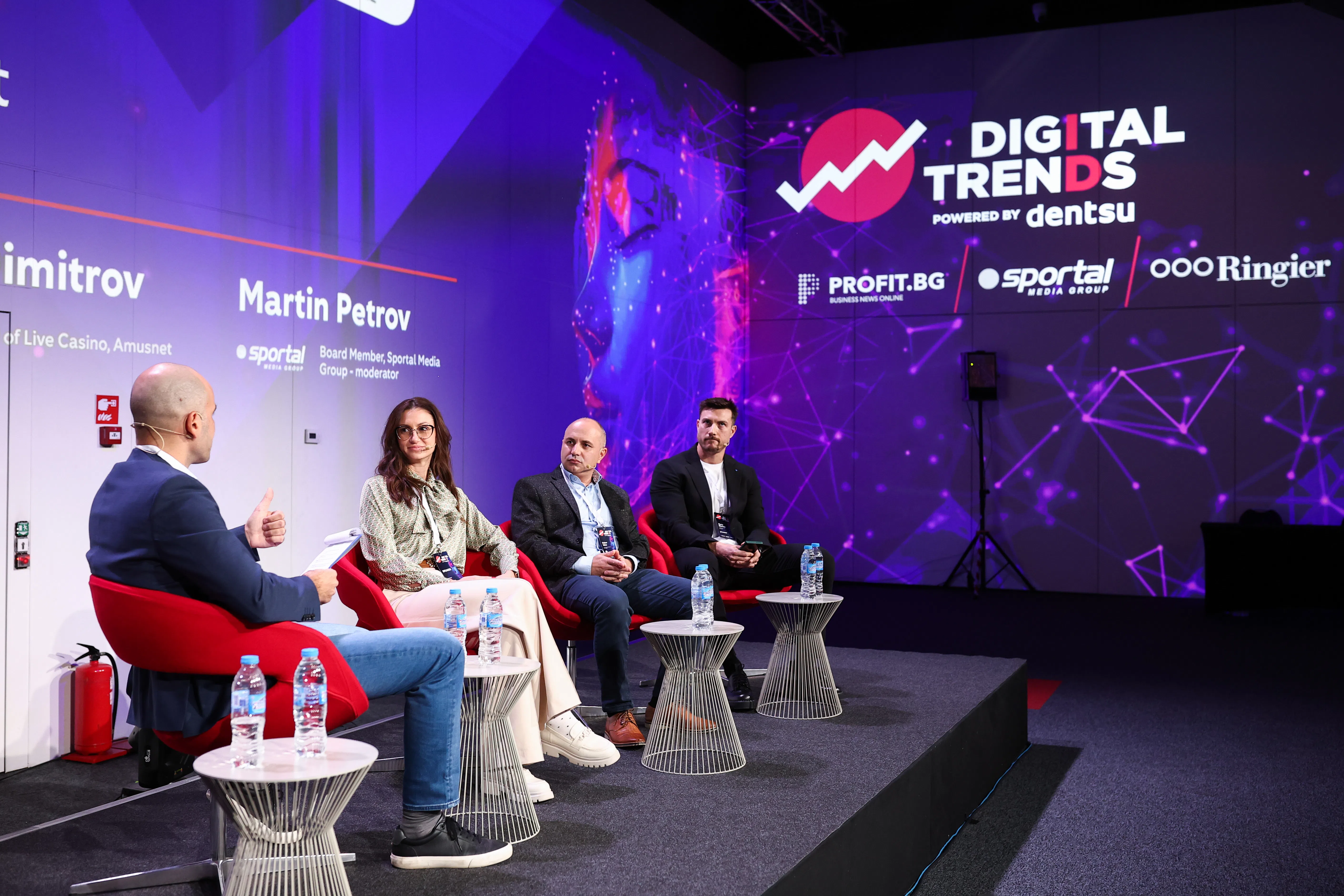 От ляво надясно: Мартин Петров, Sportal Media Group (модератор) / Теодора Митева, шеф „ Маркетинг и потребителски данни “, Flutter / Ердоан Велиев, старши инженеринг управител, EGT Digital / Марин Димитров, началник „ Live Casino “, Amusnet