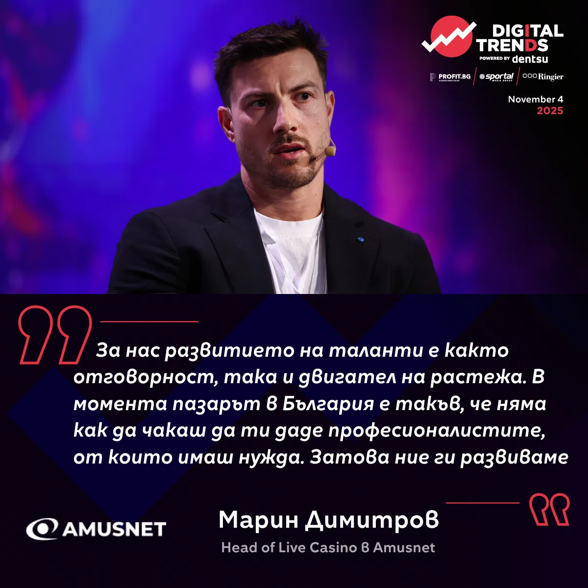 „ За нас развиването на гении е както отговорност, по този начин и мотор на растежа. Имаме доста сериозна инфраструктура, което е обвързвано с доста интервенции. В момента пазарът в България е подобен, че няма по какъв начин да чакаш да ти даде експертите, от които имаш потребност. Затова ние ги развиваме “, сподели Марин Димитров.