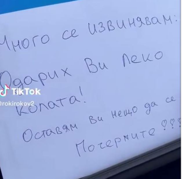 На листчето четем: " Много се оправдавам: ударих Ви леко колата. Оставям Ви нещо да се почерпите! ". До посланието се мъдри и шоколадово барче, което надали е стоплило сърцето на пострадалия лидер. Секунди откакто демонстрира бележката, мъжът разкрива и положението на автомобила. Цялата предна част на лъскавото возило е потрошена, а предният похлупак е мощно огънат.