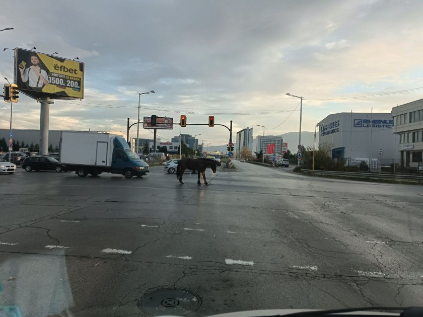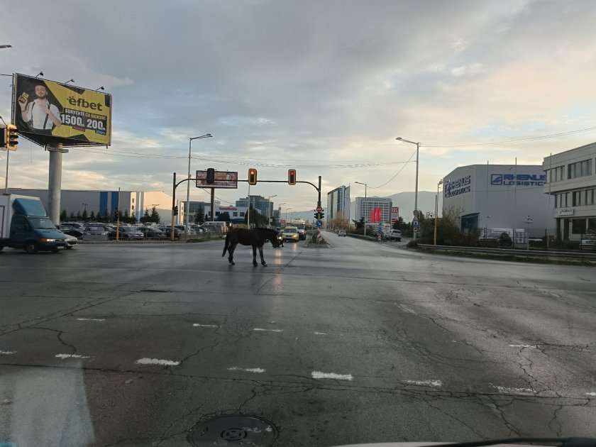 Кон се разхожда по натоварен софийски булевард в близост до летището