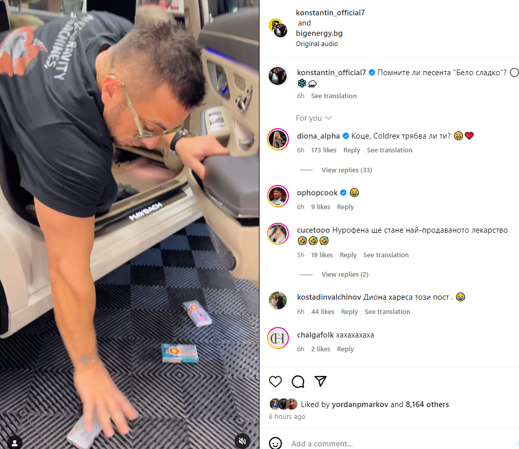 Константин не устоя и спретна следващото шеговито видео, което към този момент събира стотици гледания в обществените мрежи. Фолкпевецът, очевидно въодушевен от обстановката с опиатите и обвиняванията към Диона, която твърди, че е приемала само противогрипни прахчета, се захласна също по тях.