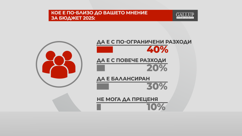 Горещата тематика до края на годината е приемането на бюджет. Според 40% от участниците в допитването би трябвало да има орязване на разноските, 30% се афишират за уравновесен бюджет, а 20 - за повече разноски.