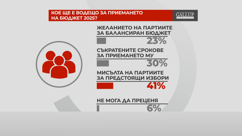 Сянката на възможните нови избори ще бъде и съществена мотивация за партиите да одобряват бюджета колкото се може по-скоро, считат над 40% от хората. Според 30% фактор е времето - по-малко от месец остава до края на 2024 година, а съгласно 23% от далите отговор партиите имат предпочитание да одобряват един уравновесен бюджет.