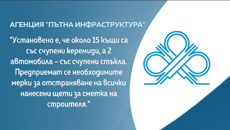 От Министерство на вътрешните работи обявиха за NOVA, че оповестението и обезопасяването са обвързване на компанията реализатор. От АПИ също изпратиха позиция: " Изпълнителят има застраховка за случаи на произшествия и вреди, нанесени на трети лица. Установено е, че към 15 къщи са със счупени керемиди, а 2 автомобила – със счупени стъкла. Предприемат се нужните ограничения за премахване на всички нанесени вреди за сметка на строителя ”, обясниха за NOVA от Агенция " Пътна инфраструктура ”.
