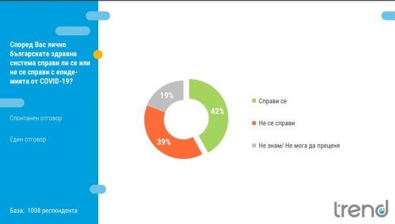 42% от българите считат, че здравната система се е справила с епидемията от COVID-19, до момента в който 39% са на противоположното мнение, демонстрира още изследването. Най-младите още веднъж в максимален дял не могат да дадат оценка. И на този въпрос с увеличение на възрастта се усилва делът на смятащите, че българската здравна система не се е справила с пандемията. Живеещите в регионалните градове и дребните градове в максимален дял са на мнение, че не се е справила с пандемията.