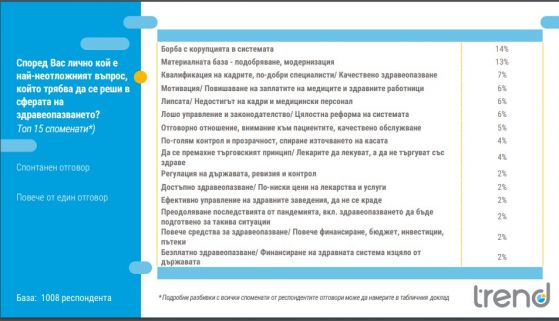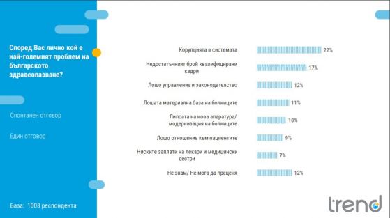 Корупцията в здравната система е най-големият проблем за българите (22%). На второ място българите показват незадоволителния брой квалифицирани фрагменти – 17%, а на трето място се подрежда неприятното ръководство и законодателство – 12%.