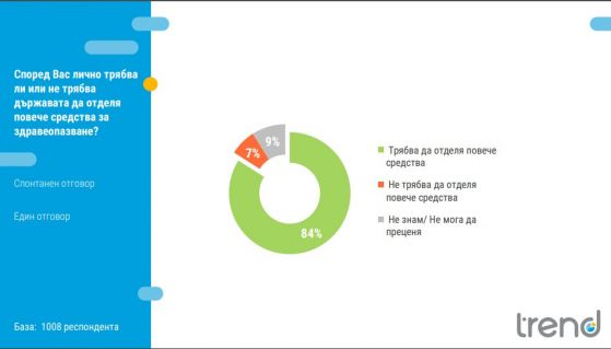 84% от българите са на мнение, че страната би трябвало да отделя повече средства за опазването на здравето, демонстрира още изследването.