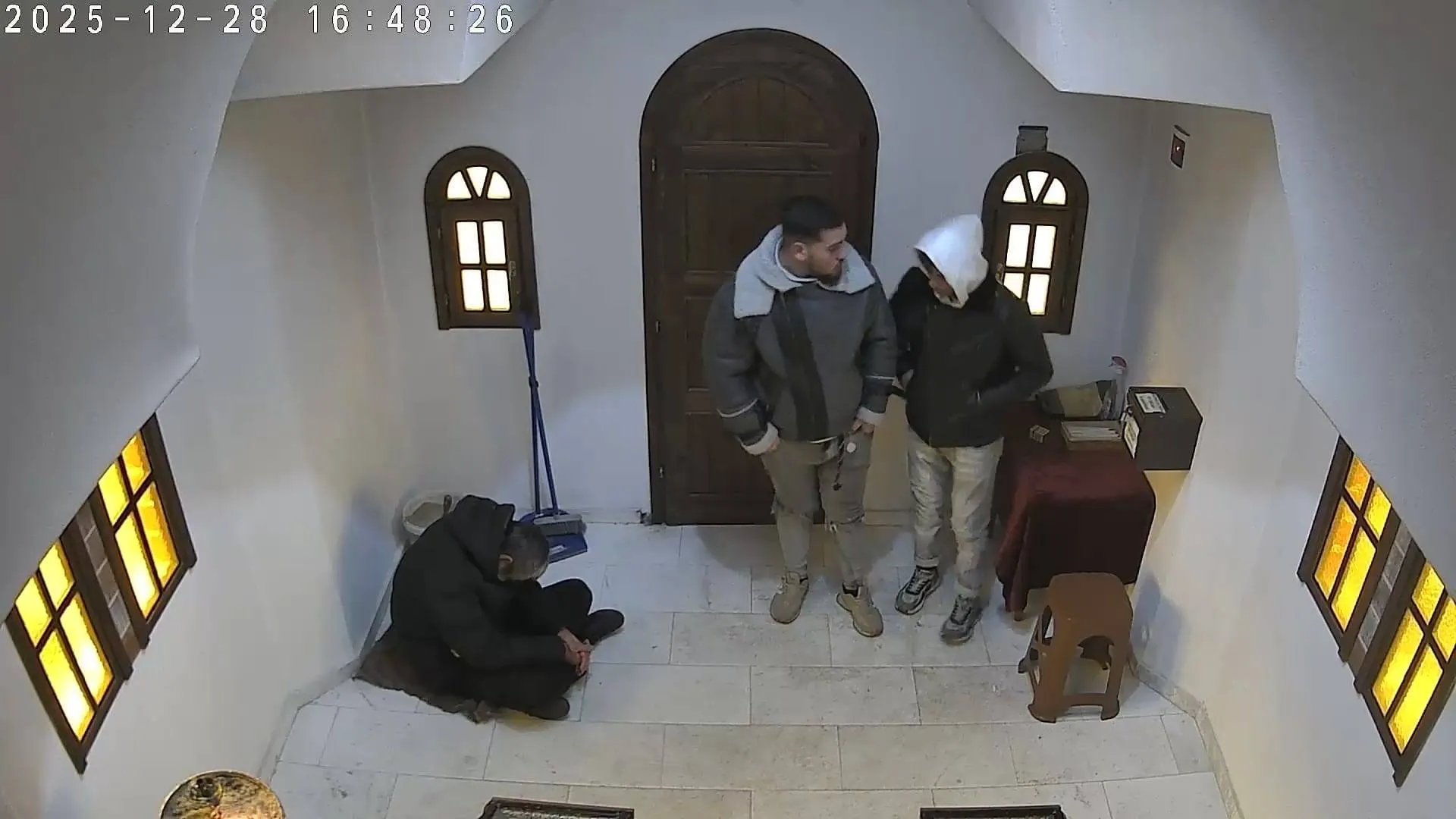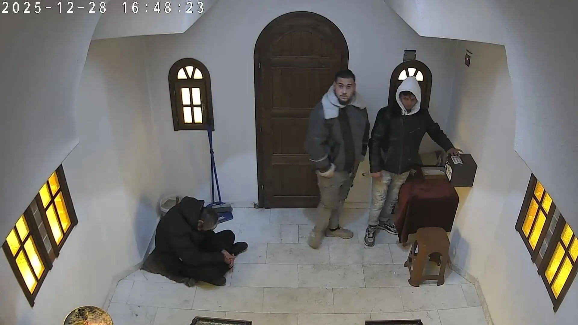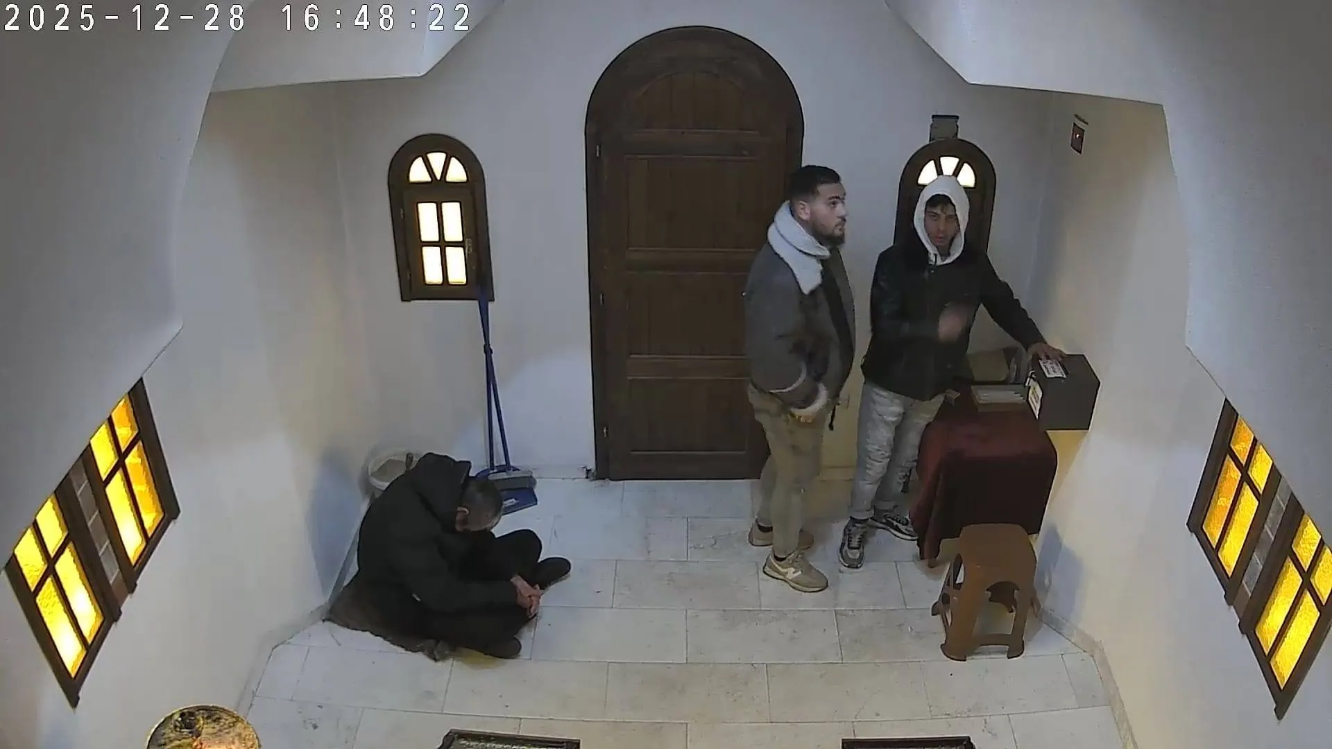 На записите от охранителна камера се виждат двама млади мъже и различен, по-възрастен, седнал на пода.