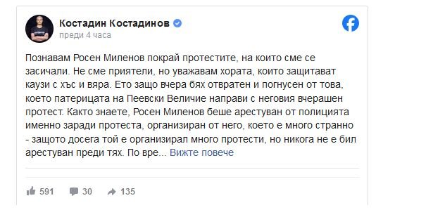 „ Досега той е провел много митинги, само че в никакъв случай не е задържан преди тях “, написа във фейсбук Костадинов.