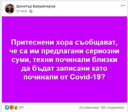 „ Притеснени хора оповестяват, че са им предлагани съществени суми техни умряли близки да бъдат записани като умряли от Covid-19? “, сигнализира на своя фейсбук профил журналистът Димитър Байрактаров.