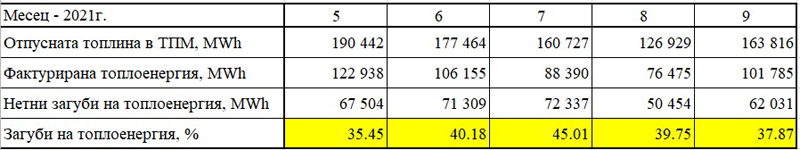 Дори при тези високи продажби (чрез настройките в абонатната станция), които съумяват да продадат на потребителите безбожно количество топлоенергия, като им подгряват 1м3 вода със стойности от порядъка на 130-150 kWh, остават едни 35-45% топлоенергия, която се губи (също видно от таблицата). Това още веднъж е в поддръжка на тезата ми за голямото излишно количество непотребна топлоенергия, която се излива по топлопреносната мрежа и която топлоенергия просто се регистрира като подадена към клиентите. Това ясно демонстрира действително загубите на столичното парно и плачевното положение на топлопреносната мрежа.