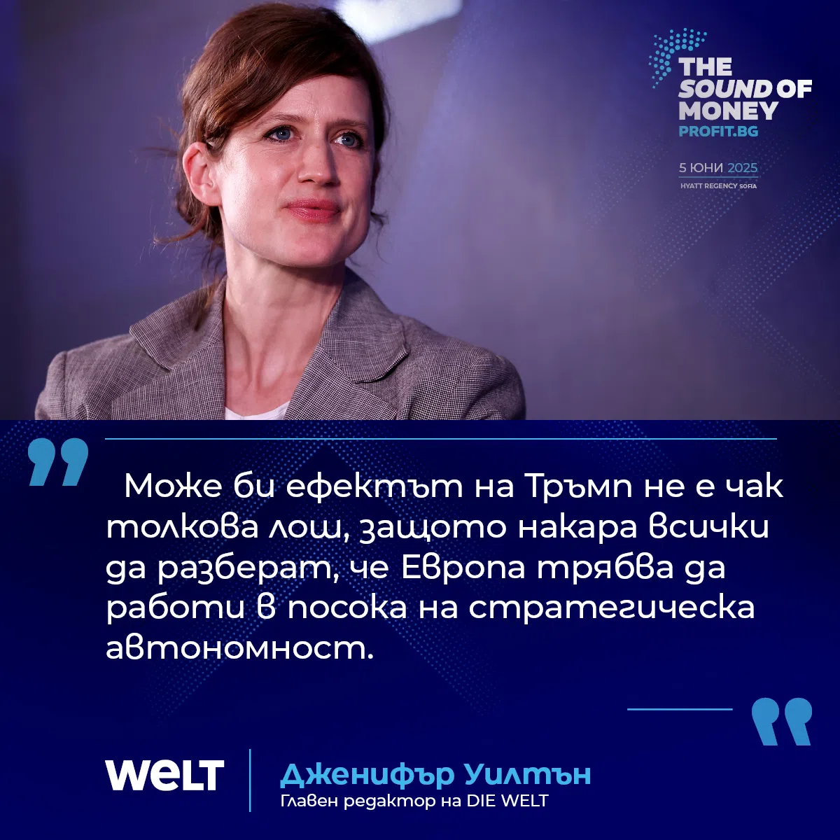 Коя е историята, която Европа споделя на себе си? Има ли кой я чуе? Главният редактор на немския всекидневник Die Welt Дженифър Уилтън приказва за всичко това от сцената на водещия стопански и финансов конгрес в България ШУМЪТ НА ПАРИТЕ 2025, който се организира ден след публикуването на позитивните отчети на EK и ЕЦБ по отношение на готовността на страната ни за присъединение към еврозоната.