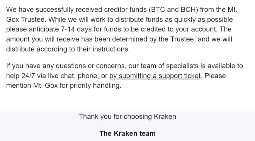 Kraken, борса за криптовалути, разгласи, че е получила средства от банкрутиралата крипто борса Mt. Gox, съгласно изказване по електронната поща.