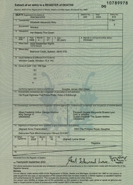 The National Records of Scotland has today published an extract from Her Majesty the Queen’s death certificate. Following her passing at Balmoral on September 8th, the Queen’s death was registered in Aberdeenshire on 16th September